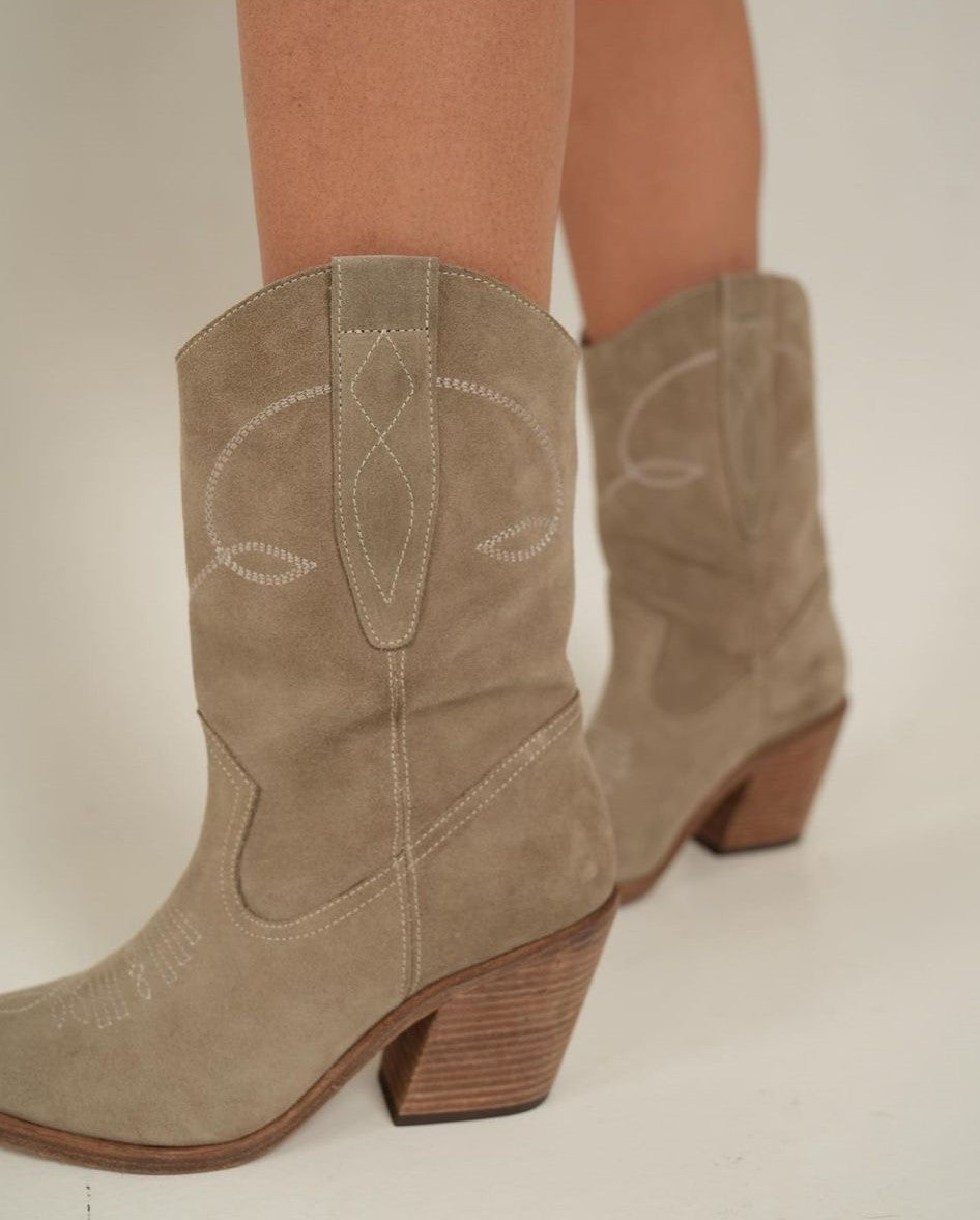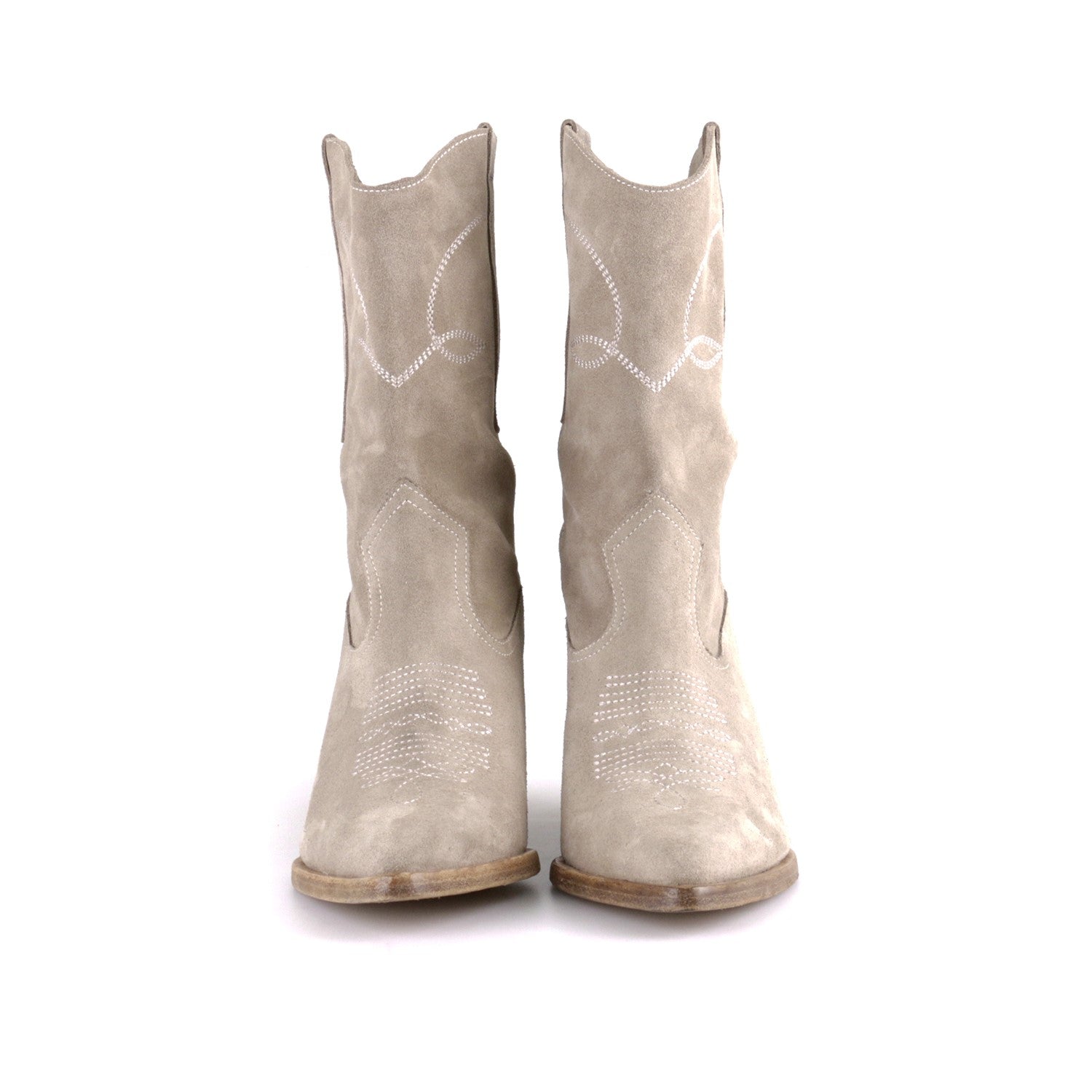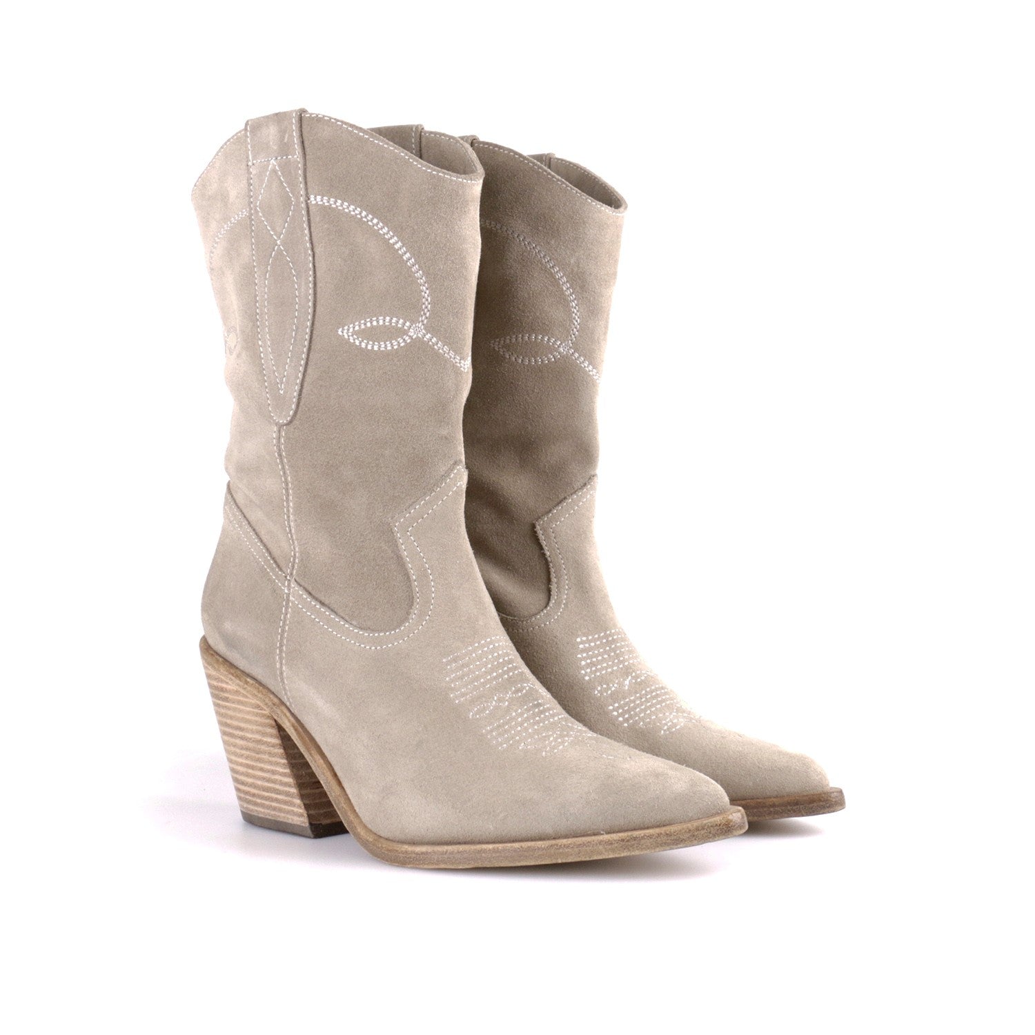 Taupe suede boot with embroidery details, featuring two pull straps and pointed toe.