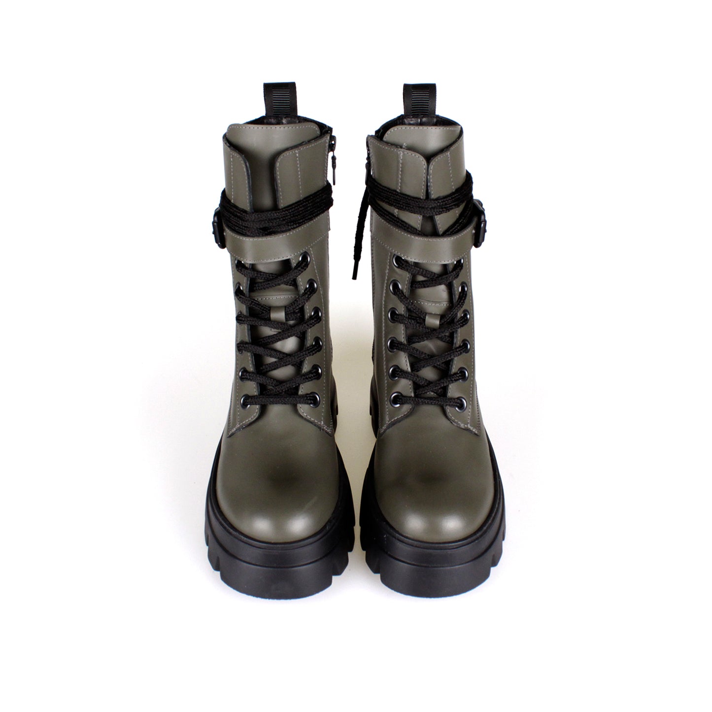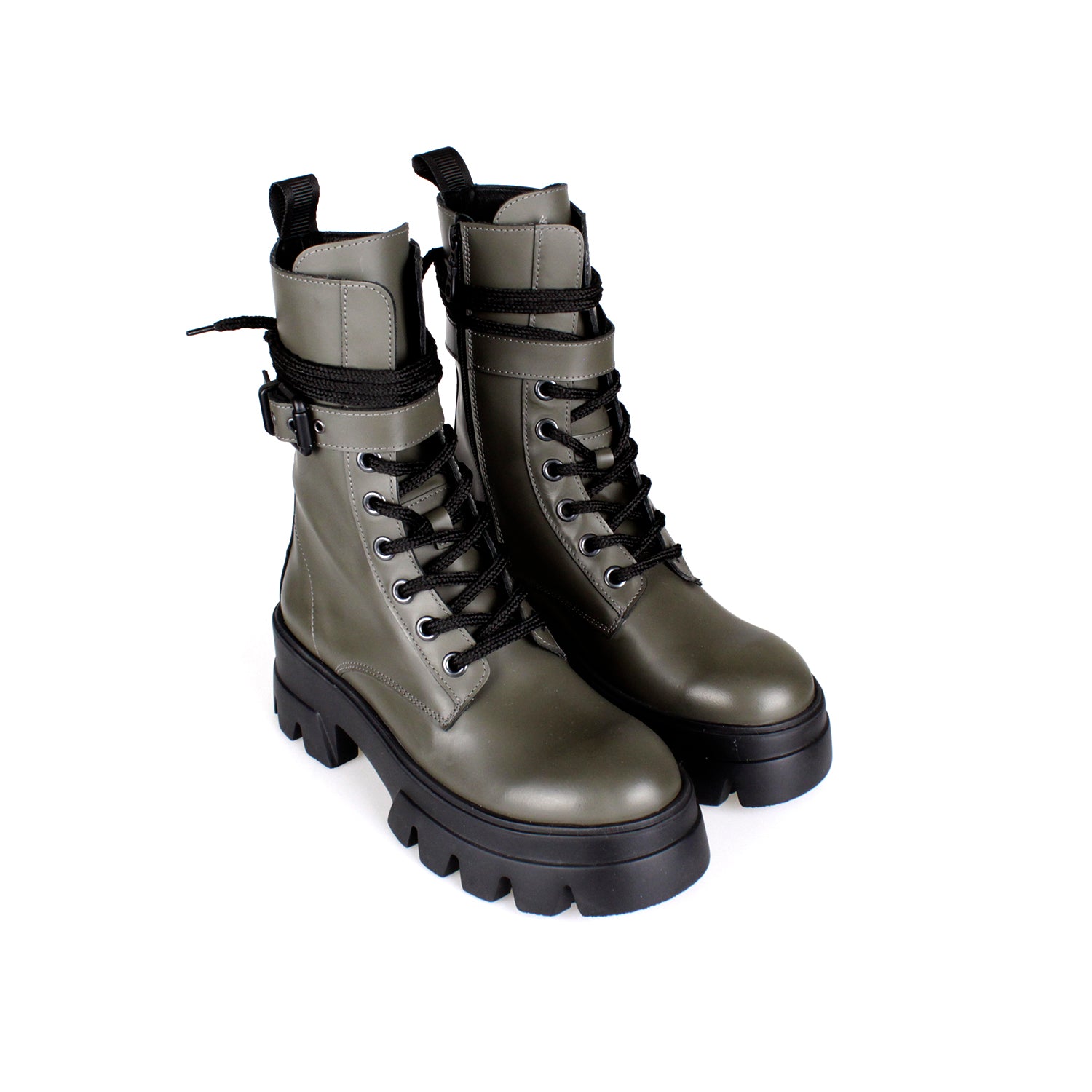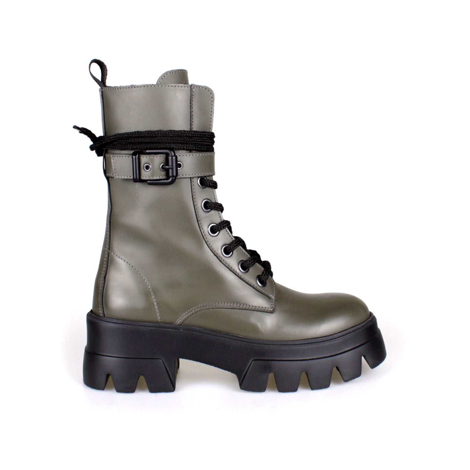 Bota média em pele com cordões, fecho de correr no interior e uma fivela preta matificada. Possui uma presilha atrás e forma arredondada.